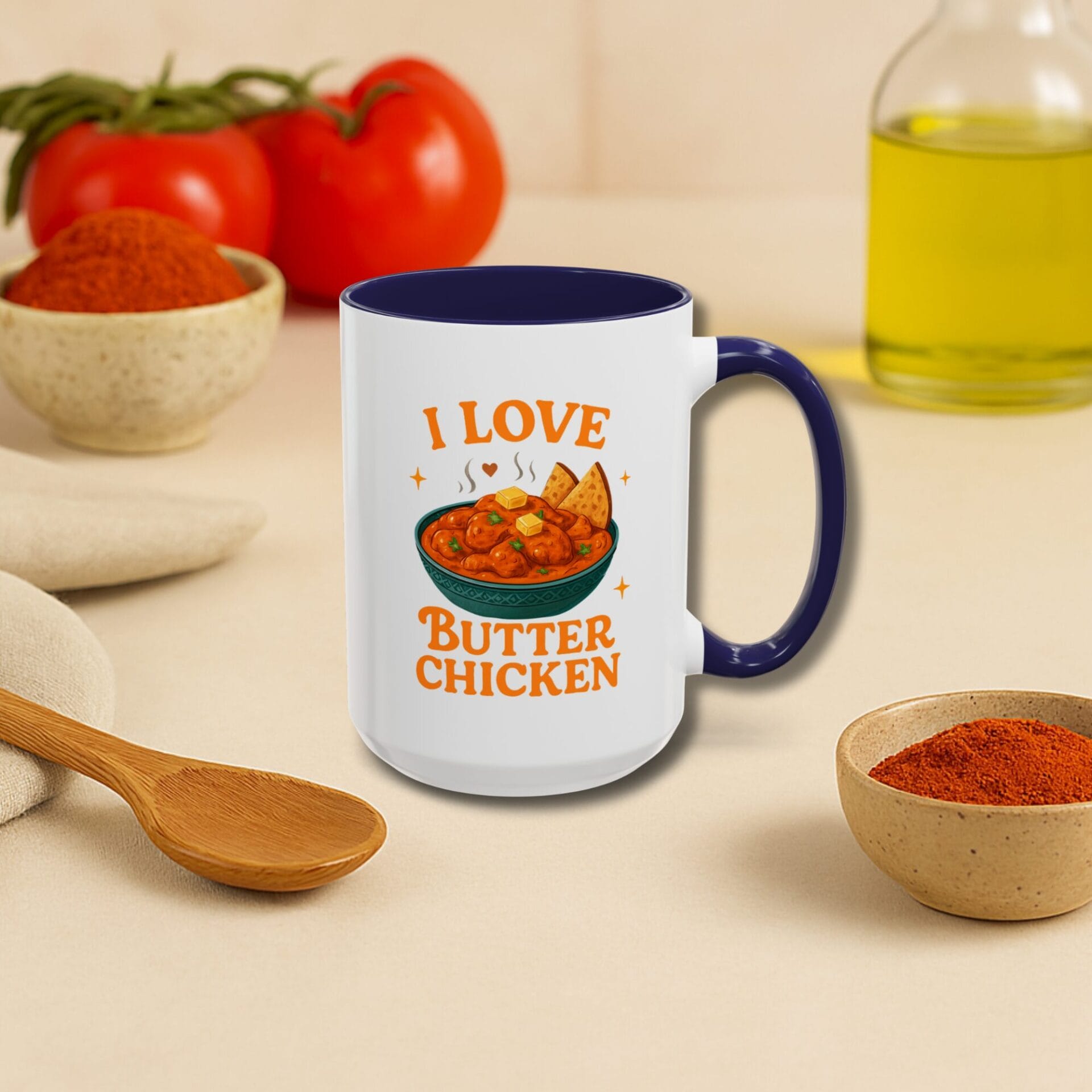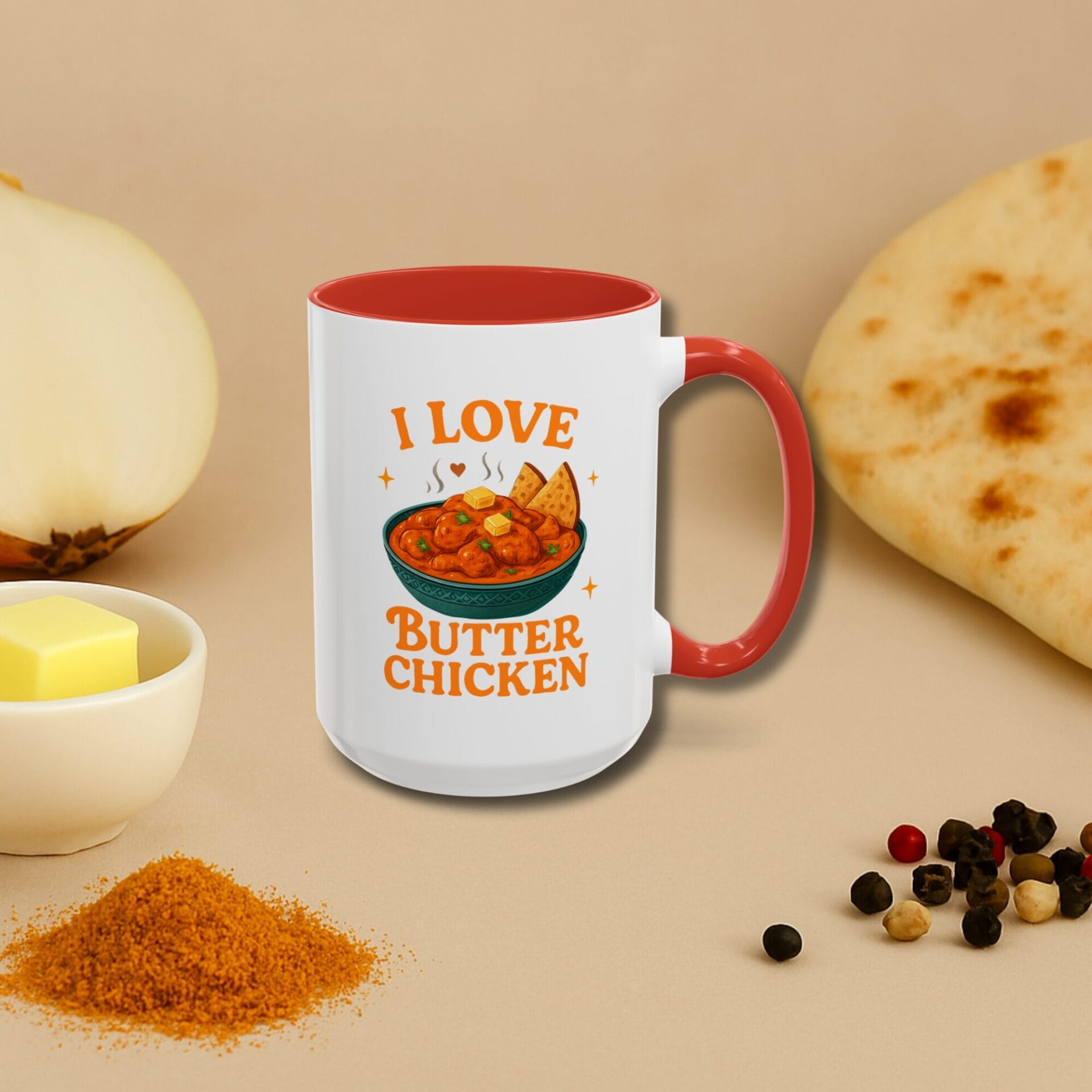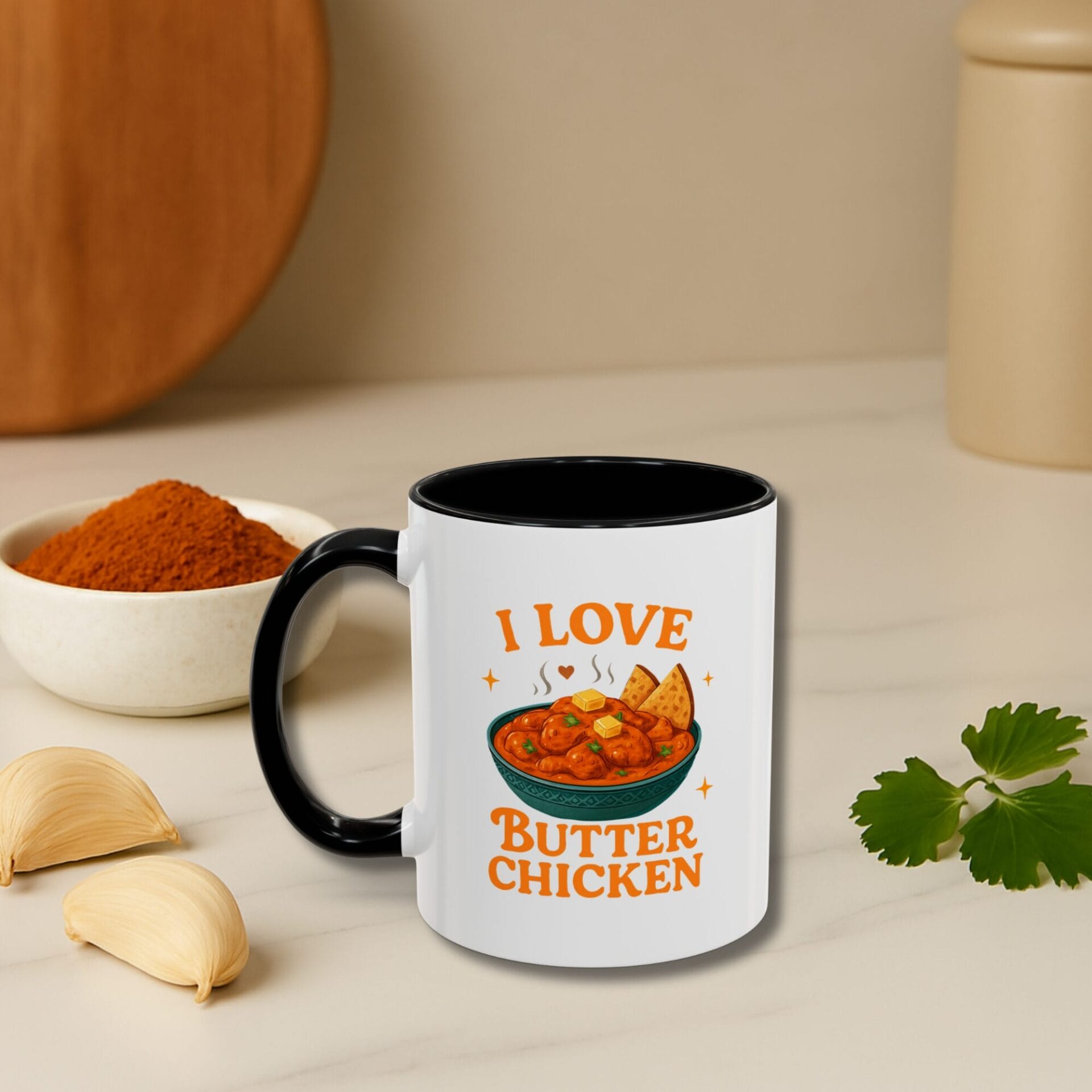 Transform your everyday beverage experience with this stunning “I Love Butter Chicken” accent mug, where the design exterior meets a vibrant colored interior and handle for ultimate visual appeal. This isn’t just a mug—it’s a statement piece that celebrates your love for Indian cuisine in style.